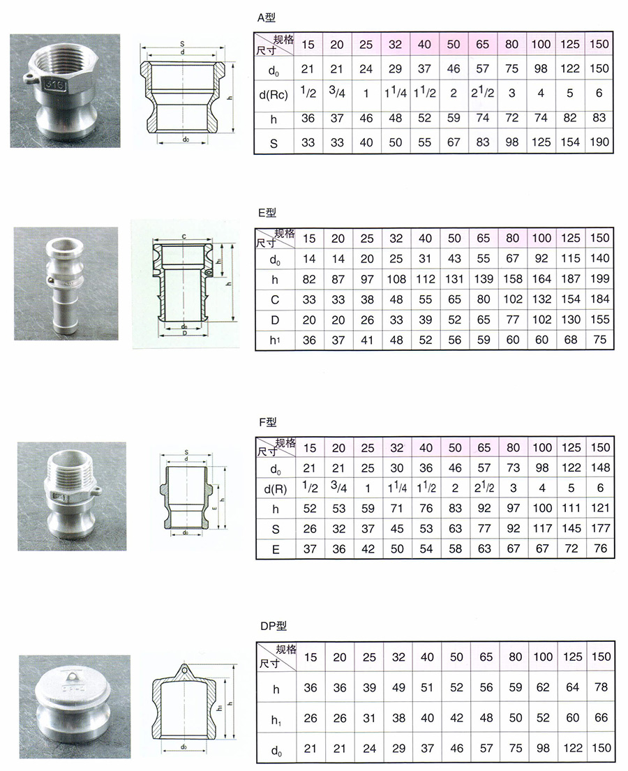 根據(jù)用戶需要,相同規(guī)格的A、E、F、DP中任何一種型號(hào)插軸可分別與B、C、D、DC中任一種型號(hào)插套可組成一接頭體。