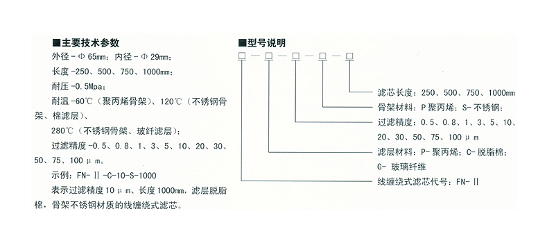 FN—III-5-1000-B表示:過濾精度為5 u m,長(zhǎng)度1000mm,端蓋為B型的聚丙烯折疊式濾芯。
